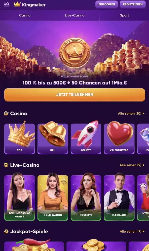 Mit Kingmaker mobiles Spielen wollen wir dir ein vollständiges Casino-Erlebnis bieten, das dem Desktop entspricht – inklusive Jackpots, Live-Dealern und vollständigen Kontoeinstellungen. Du kannst eine kurze Session auf dem Weg starten, zu Hause weiterspielen und behältst ohne Extra-Schritte dasselbe Wallet und dieselbe Spielhistorie. Unsere Lobby ist so gestaltet, dass sie auf modernen Smartphones schnell lädt, mit Filtern für Provider, Features und Spieltypen, damit du deine Favoriten rasch findest. Wenn du bei Kingmaker Casino spielst, hast du jederzeit 24/7 Zugriff über den mobilen Browser, und du kannst unsere Seite außerdem als PWA-ähnliche Verknüpfung zum Startbildschirm hinzufügen.